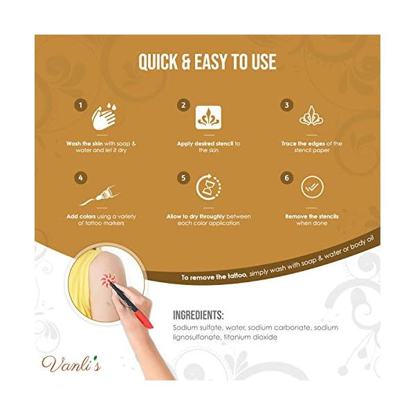 5 out of 5 stars. Best selling in temporary tattoos. Not tested on sensitive skin. Henna style body art pens. Often, they start on the hand and the design goes up and down both arms.